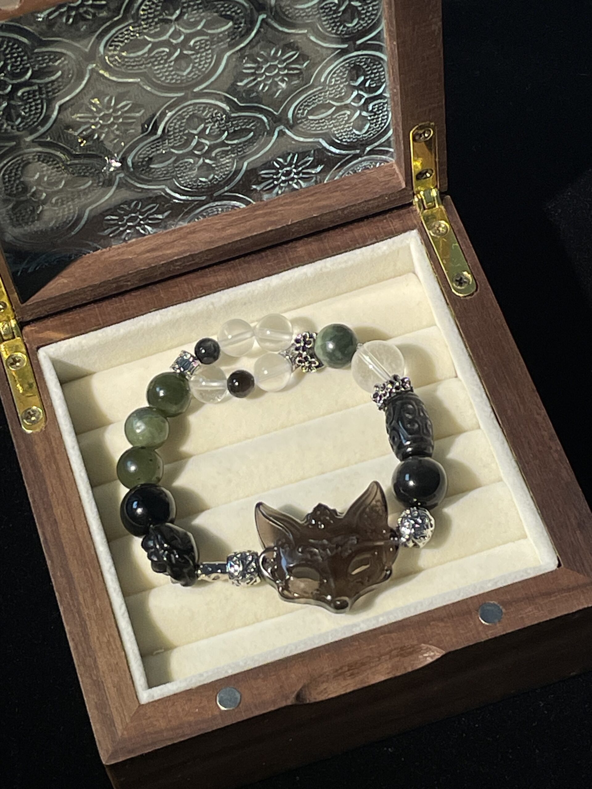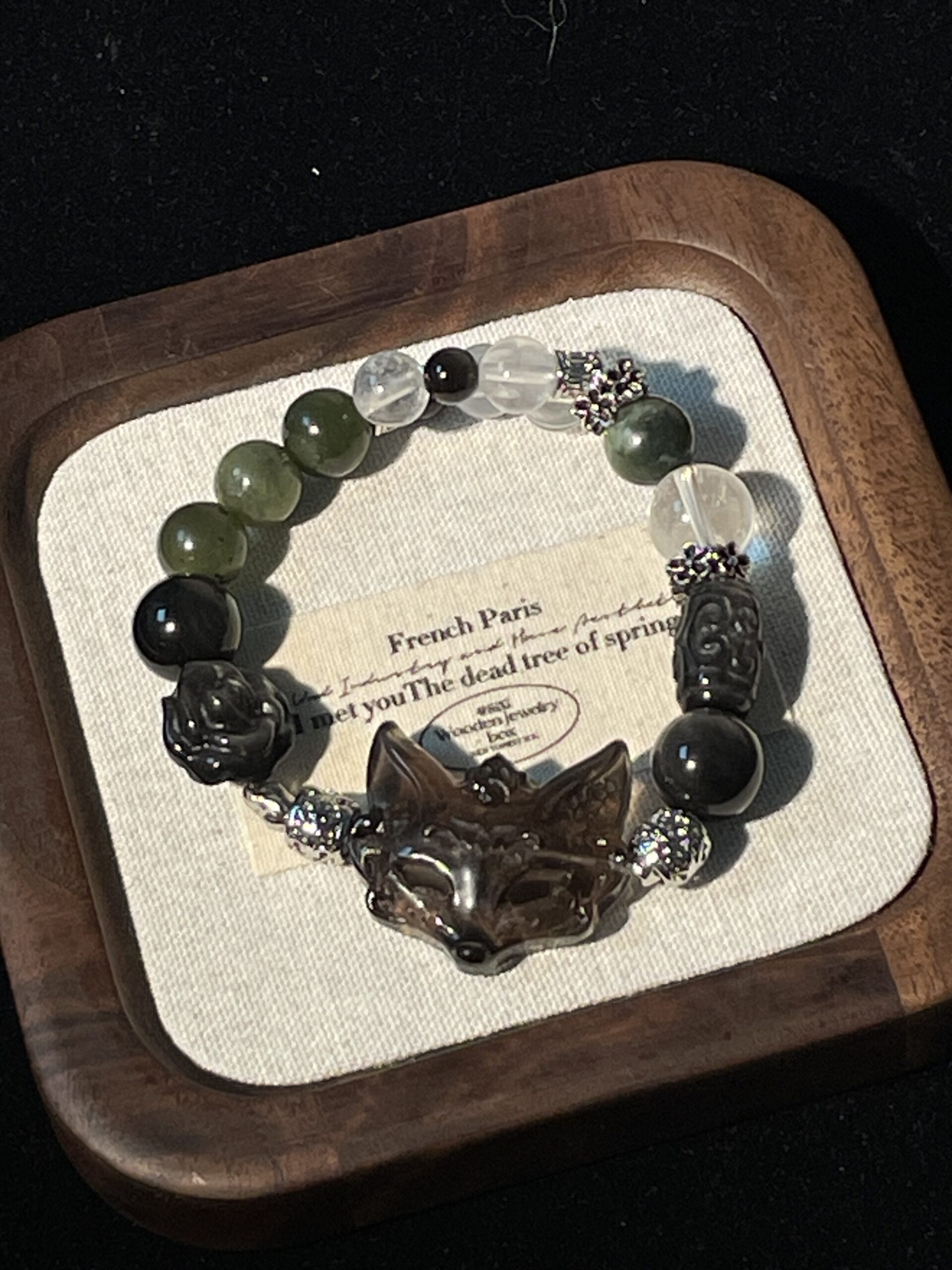 The deep green is like a dark forest. The fox accessory is a spiritual object hidden in the forest, highlighting a mysterious texture